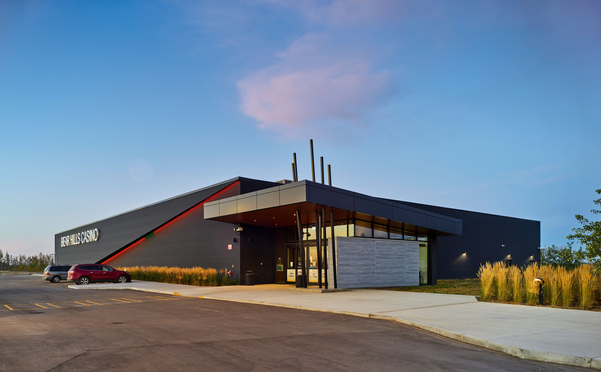 The casino design takes a simple box form and clads it in a dark metal material with a subtle break-in plane on the west elevation. A diagonal canted extrusion adds a sense of movement to the construction while at the same time serving to anchor the building. The main entrance contrasts with the solid form of the main portion of the building and is comprised of glass to highlight its location against the rest of the structure and to assist in providing a transparent and welcoming entrance to visitors. The entrance features an extended canopy supported by columns delineated from teepee poles.