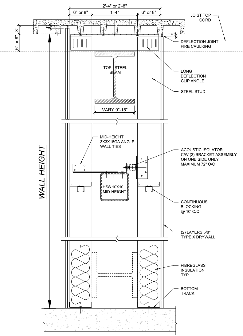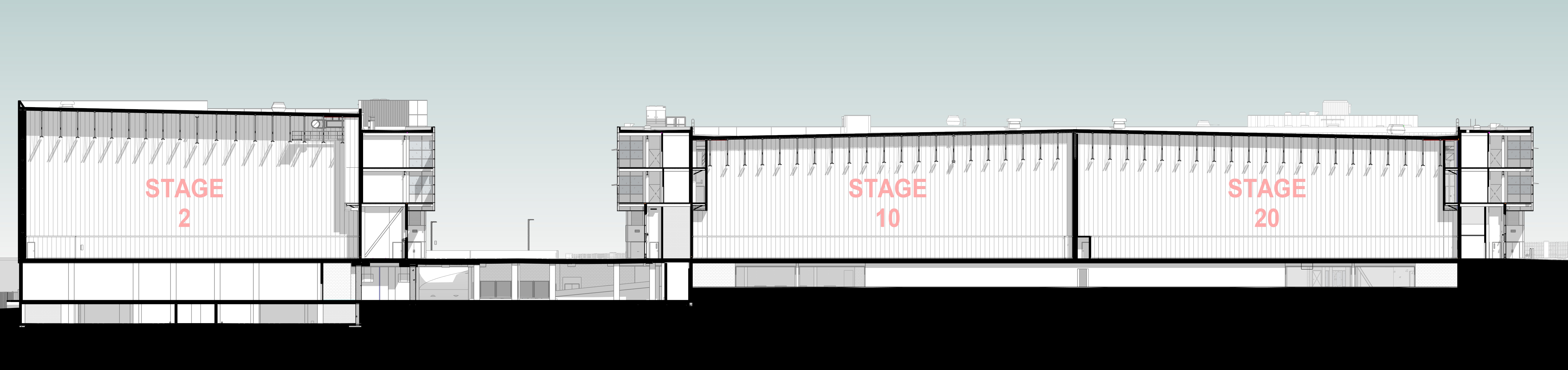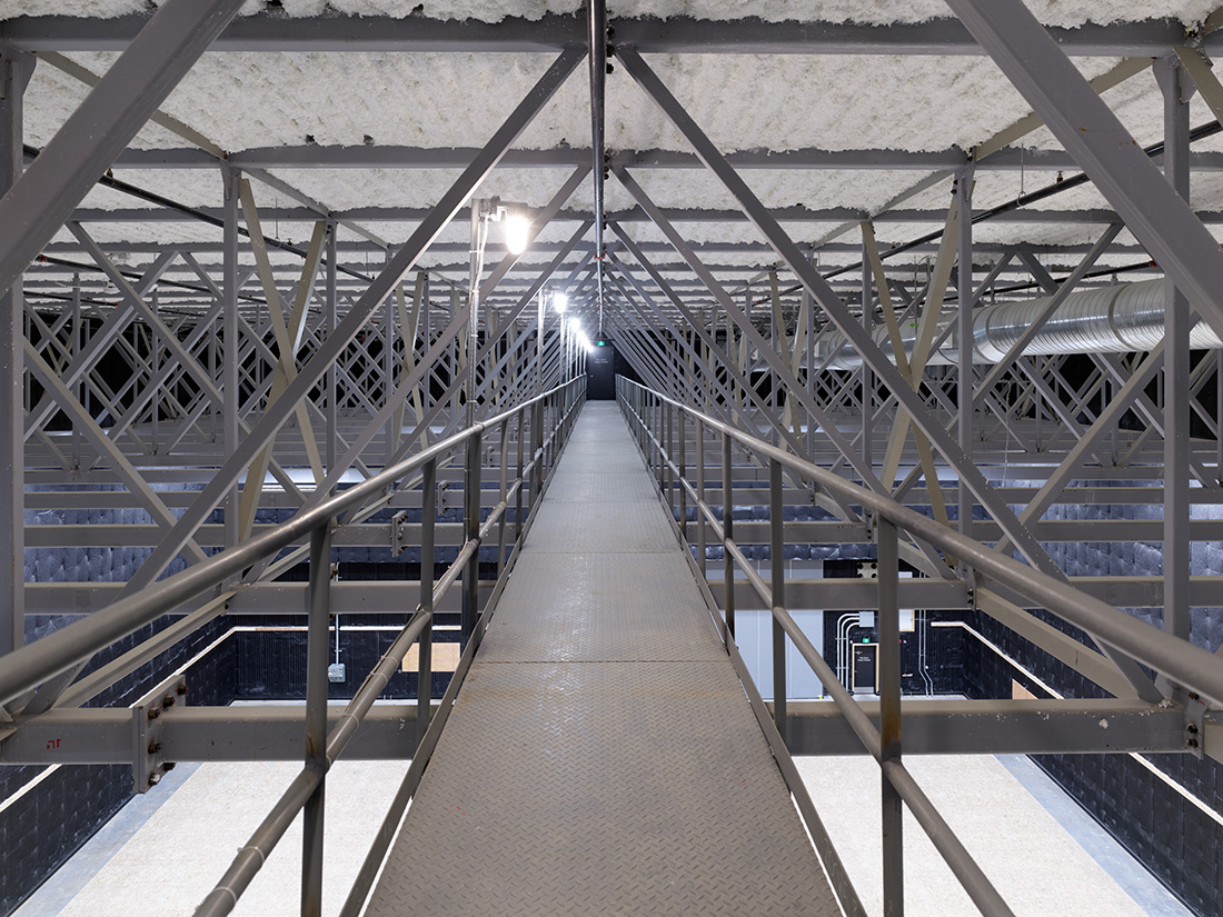 Concrete slabs directly above the underground parkade are rated for 500 lb per sq. ft., insulated to prevent sound transmission into the soundstages from vehicle engines, movement, and car alarms below. The slabs also function as two-way systems, structurally separated from adjacent soundstages to eliminate vibration transfer.